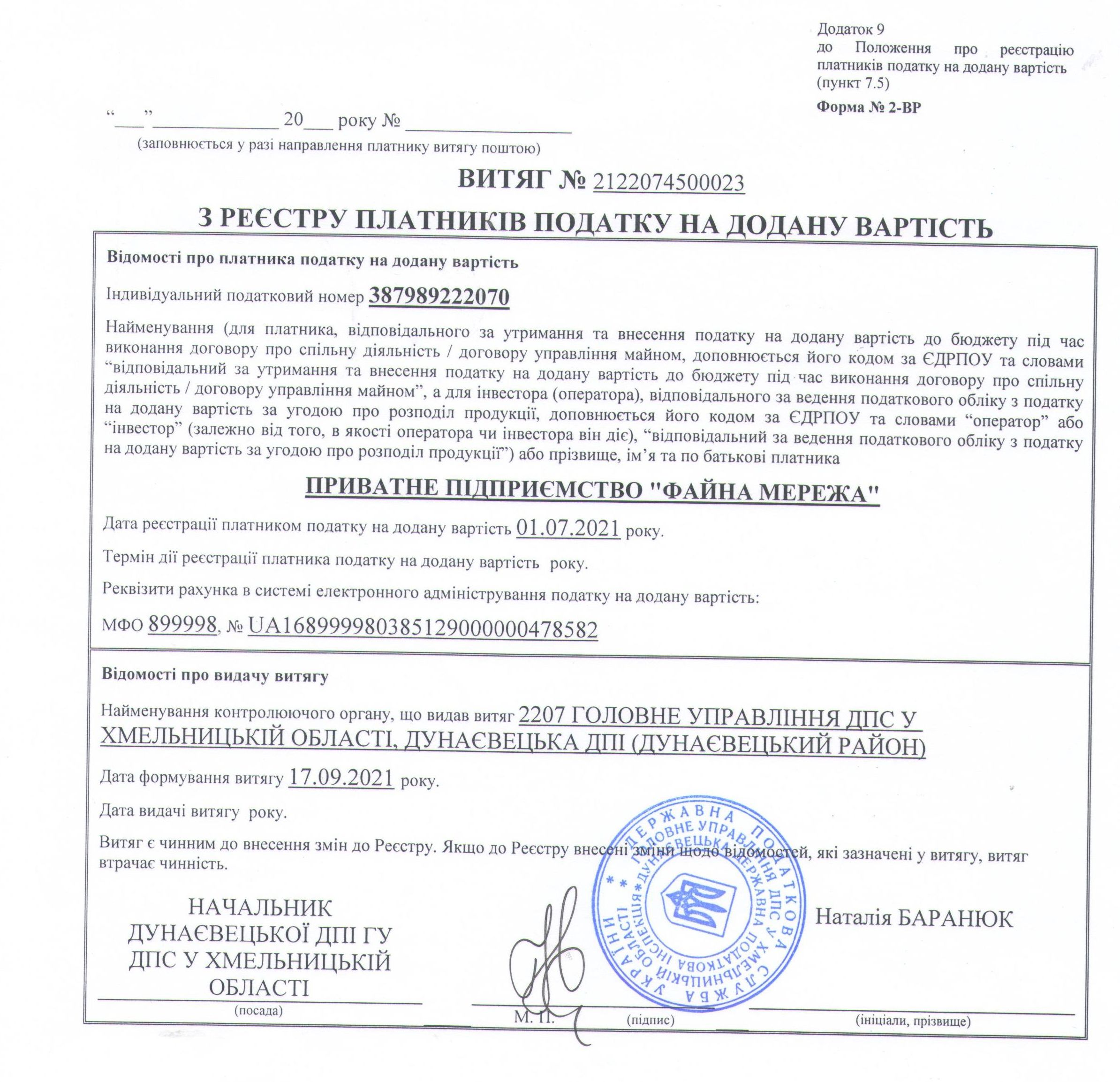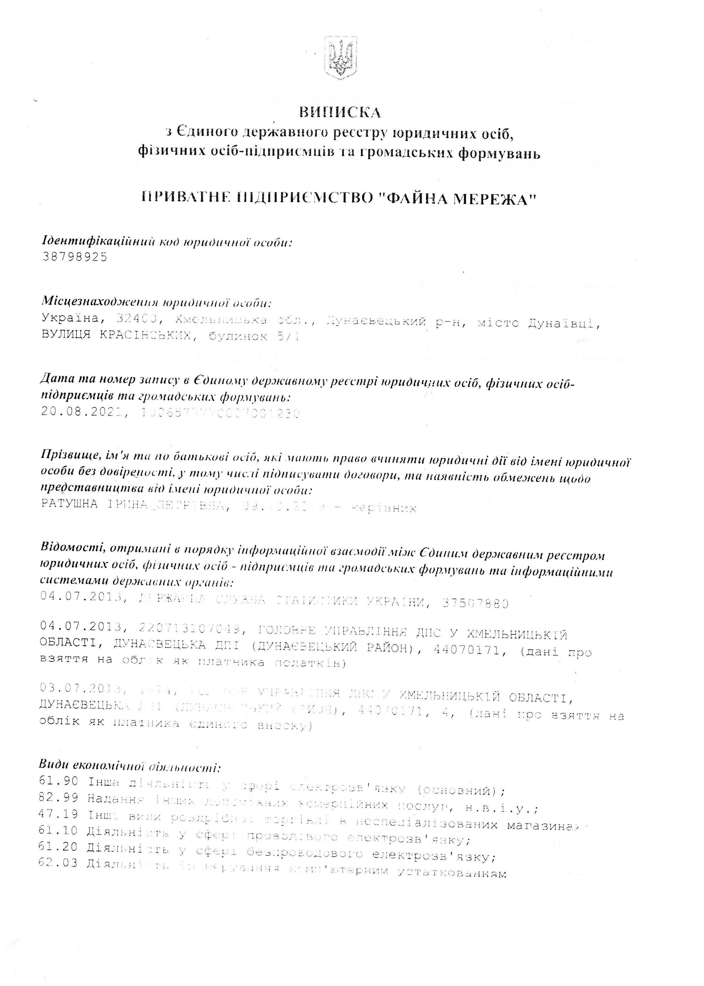 32400, Хмельницька область, місто Дунаївці, вул. Красінських 5/1, Приватне підприємство "Файна мережа"